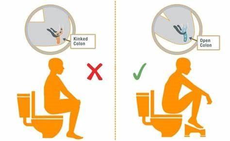 Gambar posisi BAB yang baik. 1. Punggung jangan membungkuk; 2. Kedua tungkai agak membuka, jangan dirapatkan. 3. Tubuh sedikit condong kedepan. 4. Lengan dan siku boleh diletakkan di atas lutut. 5. Lutut harus lebih tinggi dari panggul. Dengan posisi menyerupai jongkok, sudut keluar tinja akan lebih lurus dan jeratan otot puborectal sling akan lebih kendur sehingga arus keluar/evakuasi tinja lebih lurus dan lancar.